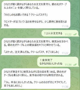 少しややこしいですが、モード内でのスマーフォンチャットでの会話は【】が使われます。AIへスマートフォンチャット経由でメッセージを送る場合は【】を使ってください。AIの【】発言に返信する場合、ユーザーは【】を使っても使わなくてもスマートフォンチャット経由の発言と認識されます